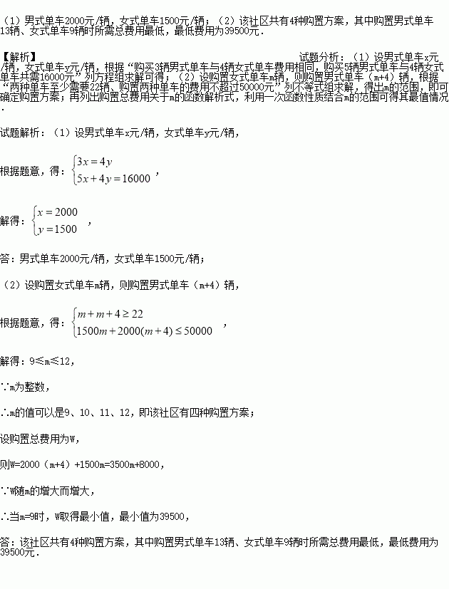(2)该社区要求男式单比女式单车多4辆,两种单车至少需要22辆,购置两种单车的费用不超过50000元,该社区有几种购置方案?怎样购置才能使所需总费用最低,最低费用是多少?