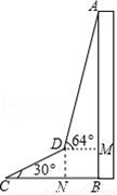为了测量出大楼AB的高度,从距离楼底B处50米的点C(点C与楼底B在同一水平面上)出发,沿倾斜角为30°的斜坡CD前进20米到达点D,在点D处测得楼顶A的仰角为64°,求大楼AB的高度(结果精确到1米)(参考数据:sin64°≈0.9,cos64°≈0.4,tan64°≈2.1,