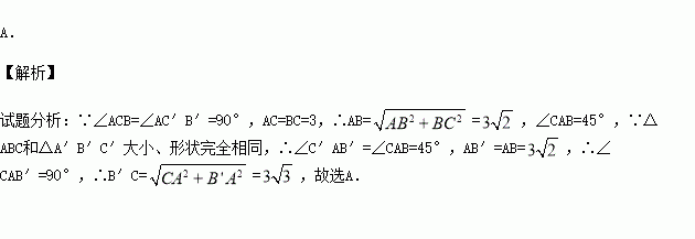 如图,将两个大小、形状完全相同的△ABC和△A′B′C′拼在一起,其中点A′与点A重合,点C′落在边AB上,连接B′C.若∠ACB=∠AC′B′=90°,AC=BC=3,则B′C的长为( )