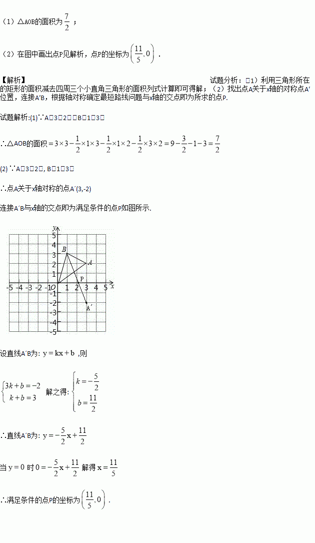 (2)点P在x轴上,当PA+PB的值最小时,在图中画出点P,并求出点P的坐标.