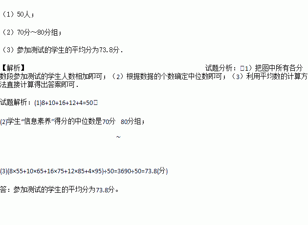 本学期初,我市教育部门对某中学从学生的品德、身心、学习、创新、国际、审美、信息、生活八个方面进行了综合评价,评价小组从八年级学生中选取部分学生针对“信息素养”进行测试,并将测试结果绘制成如下统计图(如图).根据图中信息,解答下列问题:
