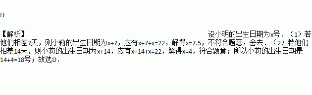 小明和小莉出生于1998年12月份,他们的出生日不是同一天,但都是星期五,且小明比小莉出生早,两人出生日期之和是22,那么小莉的出生日期是( )
