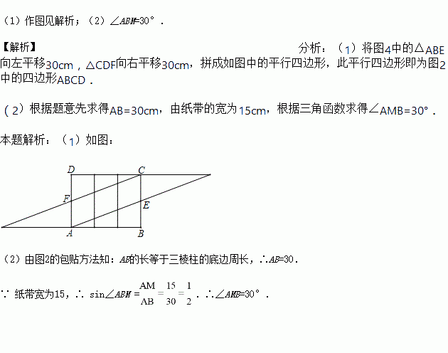 Èçͼ1ÊÇÒ»¸öÈýÀâÖù°ü×°ºÐ£¬ËüµÄµ×ÃæÊDZ߳¤Îª10cmµÄÕýÈý½ÇÐΣ¬Èý¸ö²àÃæ¶¼ÊǾØÐΣ®ÏÖ½«¿íΪ15cmµÄ²ÊÉ«¾ØÐÎÖ½´øAMCN²Ã¼ô³ÉÒ»¸öƽÐÐËıßÐÎABCD£¨Èçͼ2£©£¬È»ºóÓÃÕâÌõƽÐÐËıßÐÎÖ½´ø°´Èçͼ3µÄ·½Ê½°ÑÕâ¸öÈýÀâÖù°ü×°ºÐµÄ²àÃæ½øÐаüÌù£¨ÒªÇó°üÌùʱûÓÐÖØµþ²¿·Ö£©£¬Ö½´øÔÚ²àÃæ²øÈÆÈýȦ£¬ÕýºÃ½«Õâ¸öÈýÀâÖù°ü×°ºÐµÄ²àÃæÈ«²¿°üÌùÂú£®ÔÚͼ3ÖУ¬½«ÈýÀâÖùÑØ¹ýµãAµÄ²àÀâ¼ô¿ª£¬µÃµ½Èçͼ4µÄ²àÃæÕ¹¿ªÍ¼.ΪÁ˵õ½²Ã¼ôµÄ½Ç¶È,ÎÒÃÇ¿ÉÒÔ¸ù¾ÝÕ¹¿ªÍ¼Æ´½Ó³ö·ûºÏÌõ¼þµÄƽÐÐËıßÐνøÐÐÑо¿.