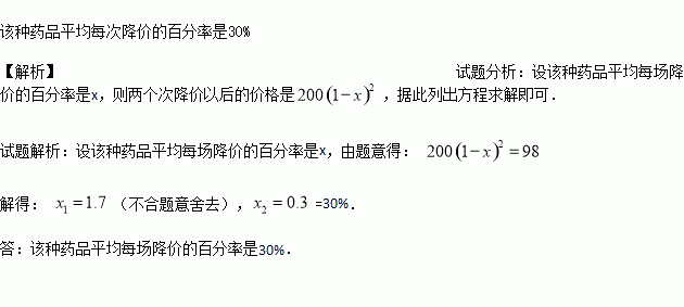 随着国家“惠民政策”的陆续出台,为了切实让老百姓得到实惠,国家卫计委通过严打药品销售环节中的不正当行为,某种药品原价200元/瓶,经过连续两次降价后,现仅卖98元/瓶,现假定两次降价的百分率相同,求该种药品平均每次降价的百分率.