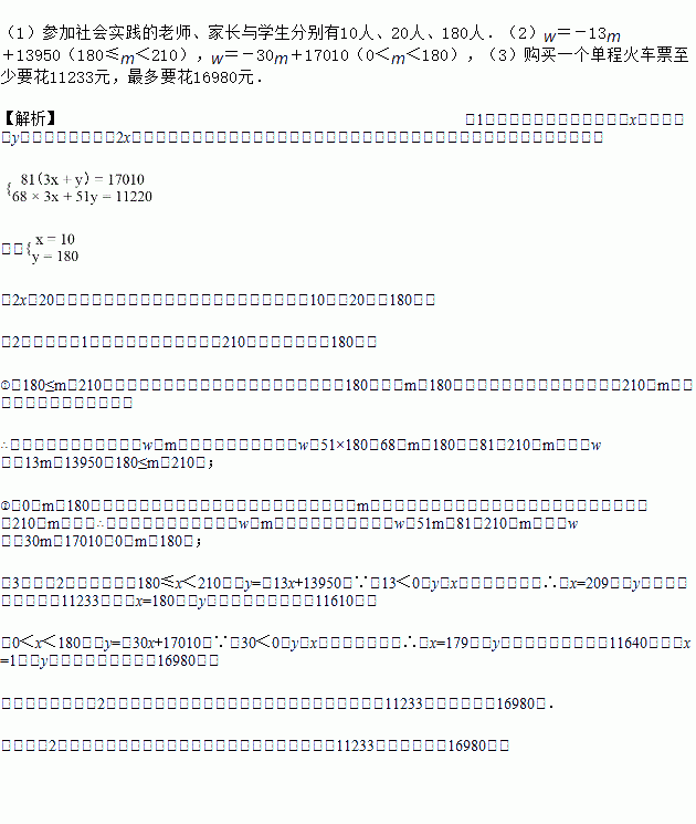 文昌某校准备组织学生及学生家长到三亚进行社会实践,为了便于管理,所有人员必须乘坐在同一列火车上;根据报名人数,若都买一等座单程火车票需17010元,若都买二等座单程火车票且花钱最少,则需11220元;已知学生家长与教师的人数之比为2∶1,文昌到三亚的火车票价格(部分)如下表所示: