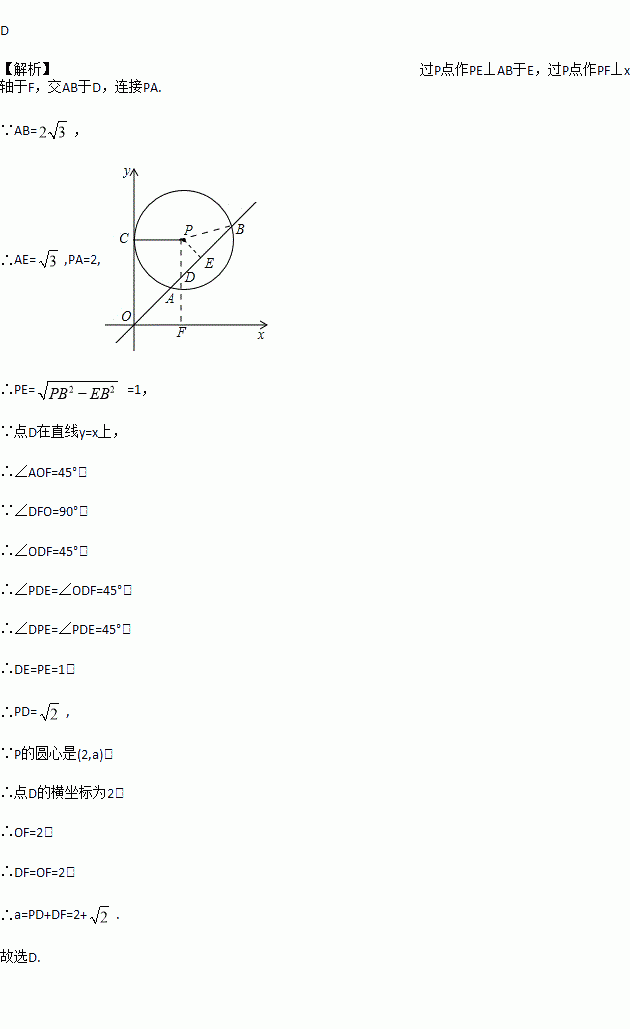 如图,在平面直角坐标系中,⊙P的圆心是(2,a)(a>2),半径为2,函数y=x的图象被⊙P截的弦AB的长为