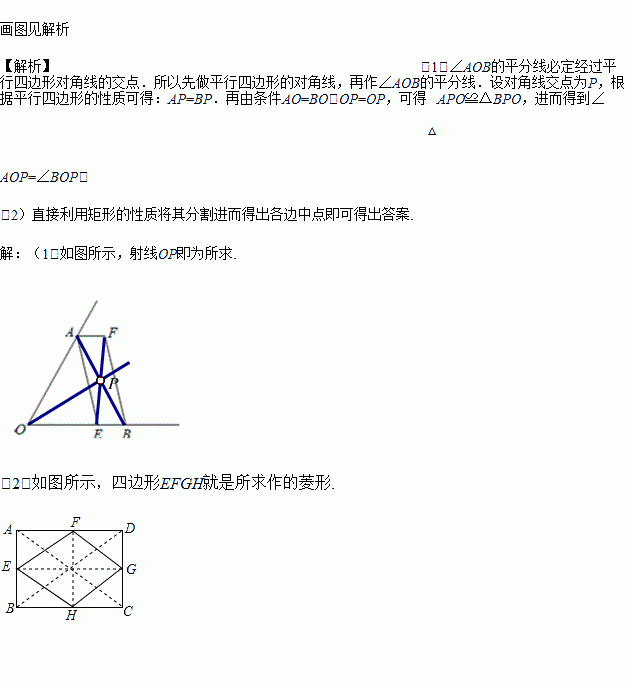 (1)如图,已知∠AOB,OA=OB,点E在OB边上,四边形AEBF是平行四边形,请你在左图中画出∠AOB的平分线.