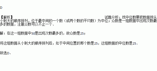 某班第一小组7名同学的毕业升学体育测试成绩(满分30分)依次为:25,23,25,23,27,30,25,这组数据的中位数和众数分别是( )