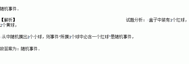 一个不透明的盒子中装有3个红球,2个黄球,这些球除了颜色外其余都相同,从中随机摸出3个小球,则事件“所摸3个球中必含一个红球”是 (填“必然事件”、“随机事件”或“不可能事件”)