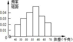 为了解全区5000名初中毕业生的体重情况,随机抽测了400名学生的体重,频率分布如图所示(每小组数据可含最小值,不含最大值),其中从左至右前四个小长方形的高依次为0.02、0.03、0.04、0.05,由此可估计全区初中毕业生的体重不小于60千克的学生人数约为_____人.