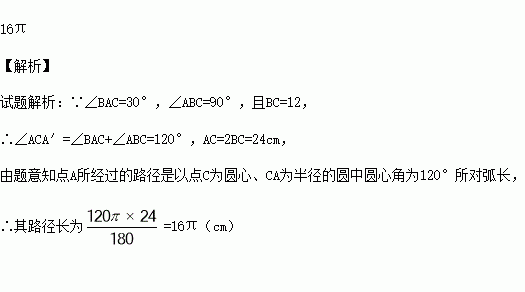 如图,一块含有30°角的直角三角板ABC,在水平桌面上绕点C按顺时针方向旋转到A′B′C′的位置,若BC=12cm,则顶点A从开始到结束所经过的路径长为 cm.