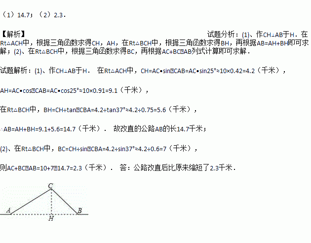 (2)问公路改直后该段路程比原来缩短了多少千米?(sin25°≈0.42,cos25°≈0.91,sin37°≈0.60,tan37°≈0.75)
