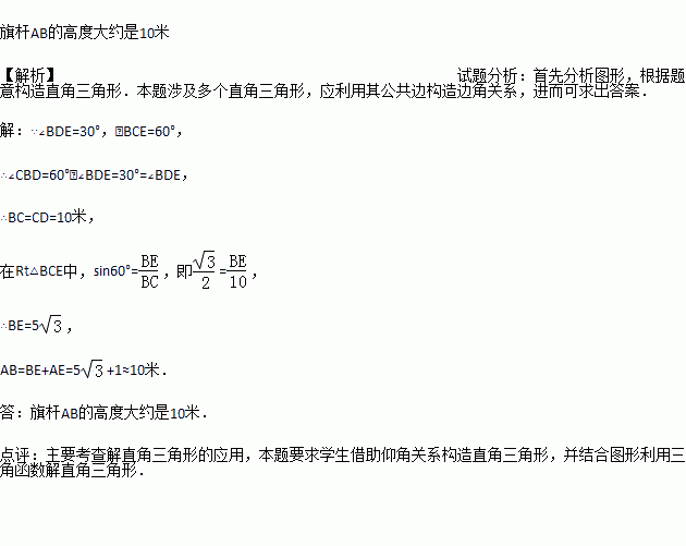 如图,小明在M处用高1米(DM=1米)的测角仪测得旗杆AB的顶端B的仰角为30°,再向旗杆方向前进10米到F处,又测得旗杆顶端B的仰角为60°,请求出旗杆AB的高度(取