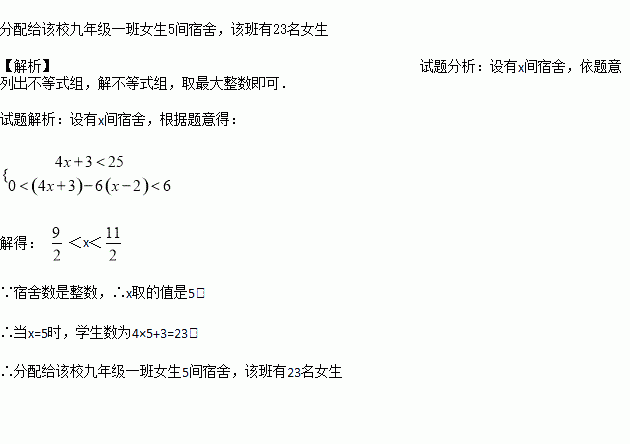 今年中考期间,我县部分乡镇学校的九年级考生选择在一中、二中的学生宿舍住宿,某学校将若干间宿舍分配给该校九年级一班的女生住宿,已知该班女生少于25人,若每个房间住4人,则剩下3人没处住;若每个房间住6人,则空一间房,并且还有一间房有人住但住不满。问分配给该校九年级一班女生多少间宿舍,该班有多少名女生?