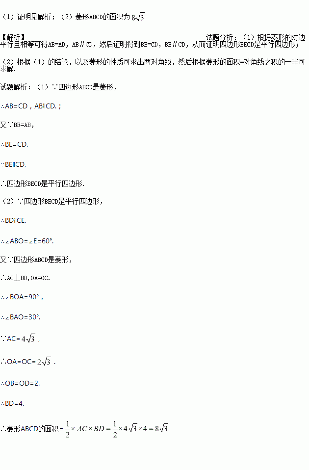 如图,已知菱形ABCD的对角线AC 、BD相交于点O,延长AB至点E,使BE=AB,连接CE.