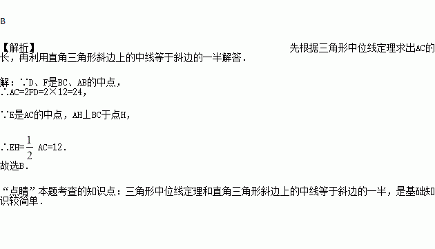 如图,在△ABC中,D,E,F分别为BC,AC,AB边的中点,AH⊥BC于H,FD=12,则HE等于( )