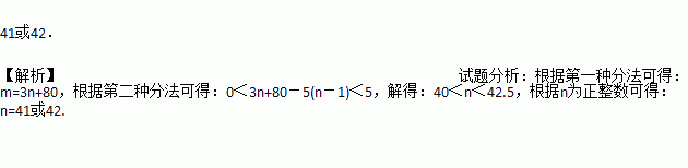 把m 个练习本分给n 个学生,如果每人分3本,那么余80本;如果每人分5本,那么最后一个同学有练习本但不足5本,n的值为___________.