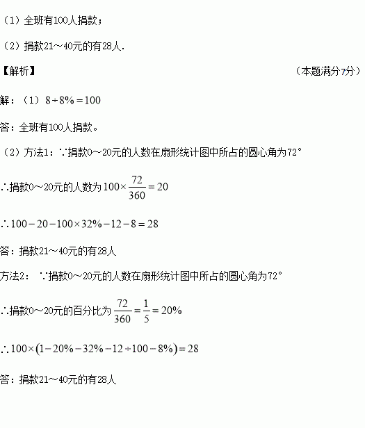 (2)如果捐款0~20元的人数在扇形统计图中所占的圆心角为72°,那么捐款21~40元的有多少人?