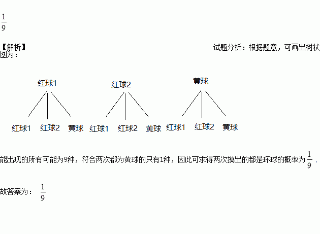 一只不透明袋子中装有2个红球、1个黄球,这些球除颜色外都相同.小明搅匀后从中任意摸出一个球,记录颜色后放回、搅匀,再从中任意摸出1个球.则两次摸出的球都是黄球的概率是 .