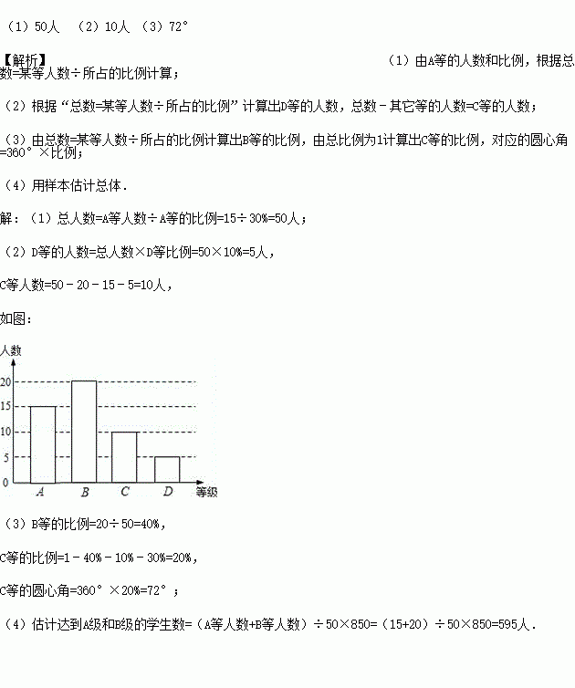(4)若该校九年级学生共有850人参加体育测试,估计达到A级和B级的学生共有