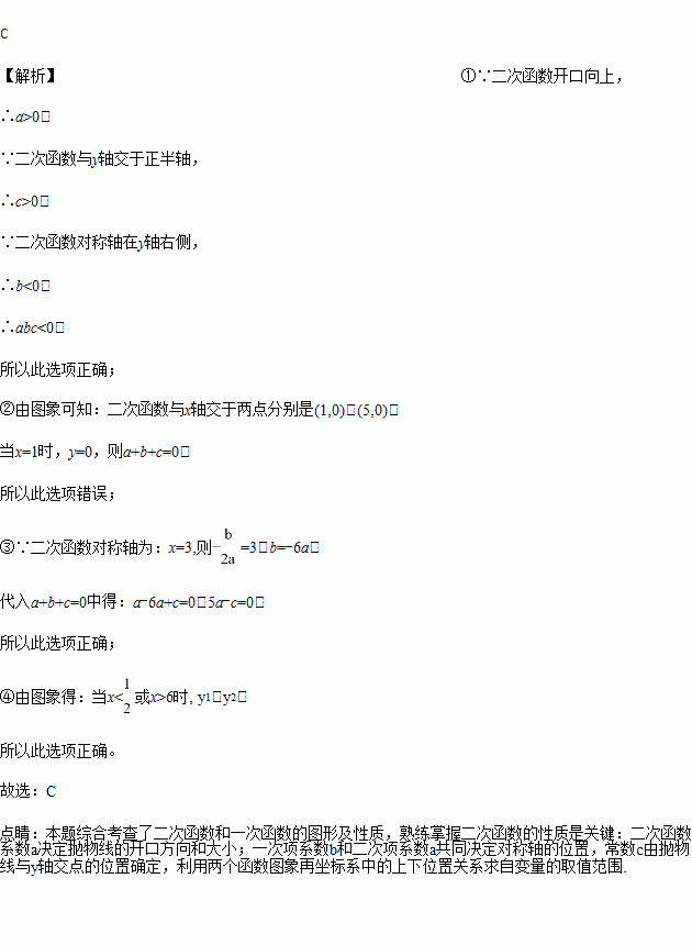 抛物线y1=ax2+bx+c的对称轴是x=3,与x轴的一个交点为(5,0);它与直线y2=mx+n的图象如图所示,下列判断中:①abc<0;②a+b+c>0;③5a﹣c=0; ④当