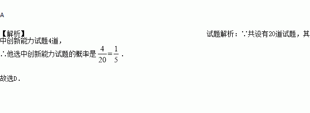 某校组织知识竞赛,共设有20道试题,其中有关中国优秀传统文化的试题有10道,实践应用试题有6道,创新能力试题有4道.小婕和小红从中任选一道试题(选题可相同)作答,她们都选中创新能力试题的概率是( )