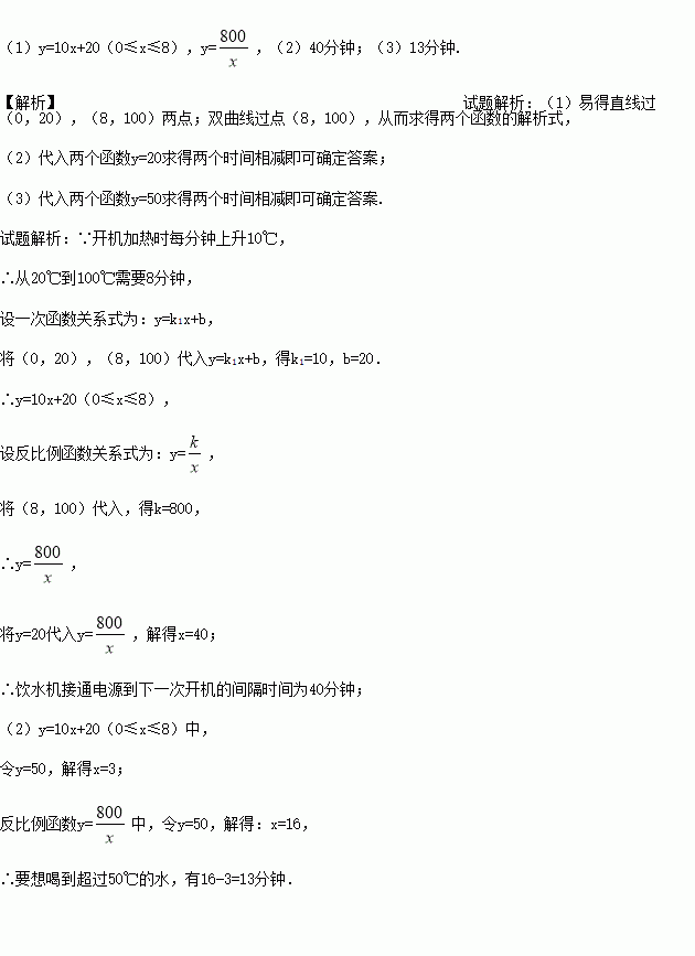)我校的饮水机接通电源就进入自动程序,开机加热时每分钟上升10℃,加热到100℃,停止加热,水温开始下降,此时水温(℃)与开机后用时(mi