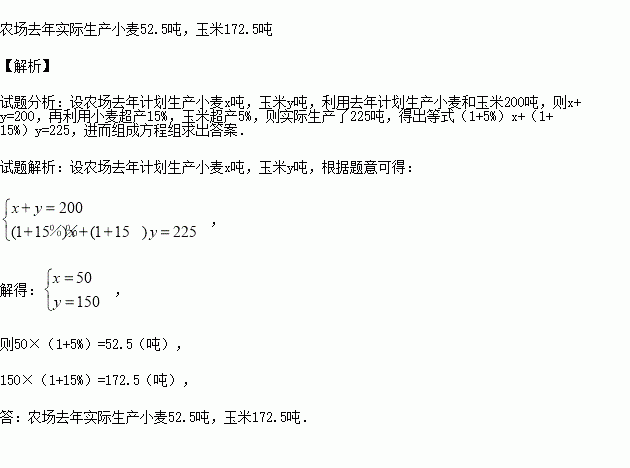某农场去年计划生产玉米和小麦共200吨.采用新技术后,实际产量为225吨,其中玉米超产5%,小麦超产15%.该农场去年实际生产玉米、小麦各多少吨?