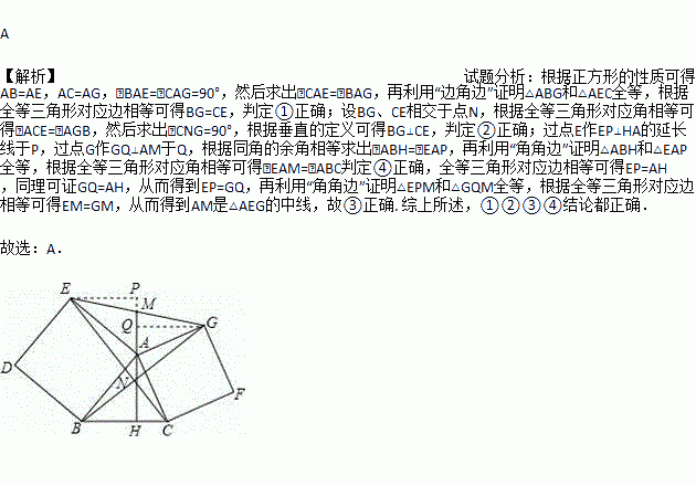 在锐角三角形ABC中,AH是BC边上的高,分别以AB、AC为一边,向外作正方形ABDE和ACFG,连接CE、BG和EG,EG与HA的延长线交于点M,下列结论:①BG=CE;②BG⊥CE;③AM是△AEG的中线;④∠EAM=∠ABC,其中正确结论的个数是( ).