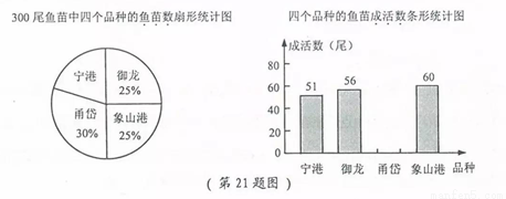大黄鱼是中国特有的地方性鱼类,有“国鱼”之称,由于过去滥捕等多种因素,大黄鱼资源已基本枯竭,目前,我市已培育出十余种大黄鱼品种,某鱼苗人工养殖基地对其中的四个品种“宁港”、“御龙”、“甬岱”、“象山港”共300尾鱼苗进行成活实验,从中选出成活率最高的品种进行推广,通过实验得知“甬岱”品种鱼苗成活率为