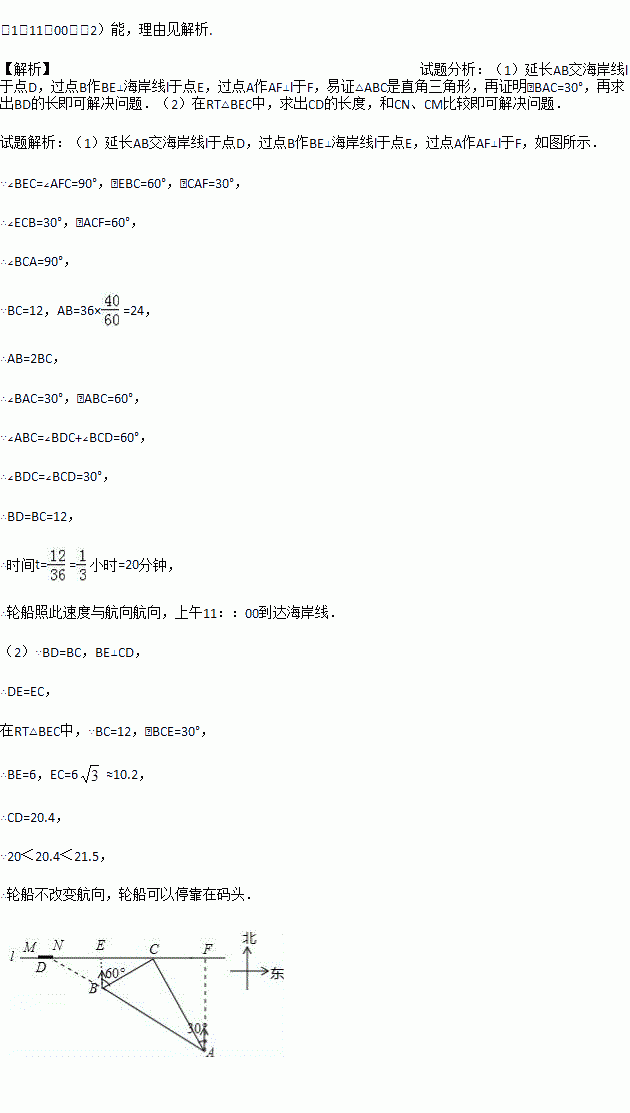如图,在一条笔直的东西向海岸线l上有一长为1.5km的码头MN和灯塔C,灯塔C距码头的东端N有20km.一轮船以36km/h的速度航行,上午10:00在A处测得灯塔C位于轮船的北偏西30°方向,上午10:40在B处测得灯塔C位于轮船的北偏东60°方向,且与灯塔C相距12km.