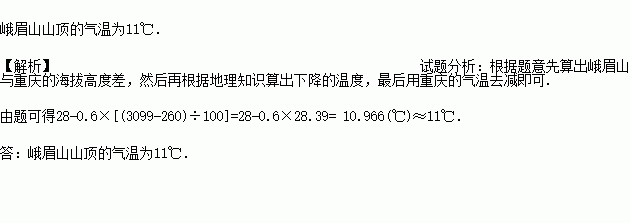 由地理知识可知:各地的气温受海拔高度的影响,海拔每升高100米,气温就下降0.6℃,现已知重庆的海拔高度约为260米,峨眉山的海拔高度约为3099米,则当重庆气温为28℃时,峨眉山山顶的气温为多少?(精确到个位)