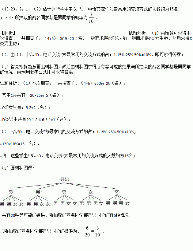 (3)在本次调查中以“C.短信与书信交流”为最常用交流方式的几位同学中随机抽取两名同学参加广州市中学生书信节比赛,请用列举法求所抽取的两名同学都是男同学的概率.