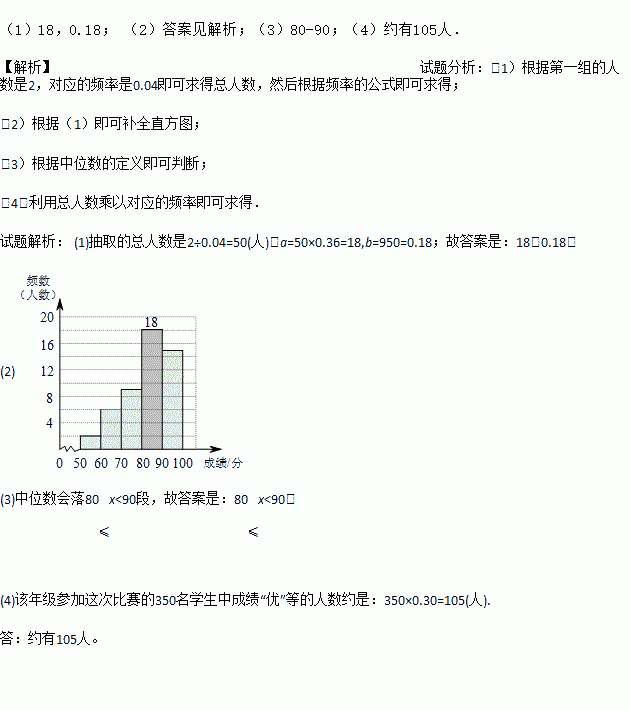 (4)若成绩在90分以上(包括90分)的为“优”等,则该年级参加这次比赛的350名学生中成绩“优”等的约有多少人?