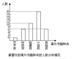 某中学为了解该校学生阅读课外书籍的情况,学校决定围绕“在艺术类、科技类、动漫类、小说类、其他类课外书籍中,你最喜欢的课外书籍种类是什么?(只写一类)”的问题,在全校范围内随机抽取部分同学进行问卷调查,并将调查问卷适当整理后绘制成如图所示的条形统计图.