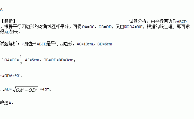 如图,在□ABCD中,∠ODA= 90°,AC=10 cm,BD=6 cm,则BC的长为( )