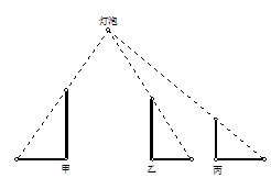 三根垂直地面的木杆甲、乙、丙,在路灯下乙、丙的影子如图所示。试确定路灯灯炮的位置,再作出甲的影子。(不写作法,保留作图痕迹)