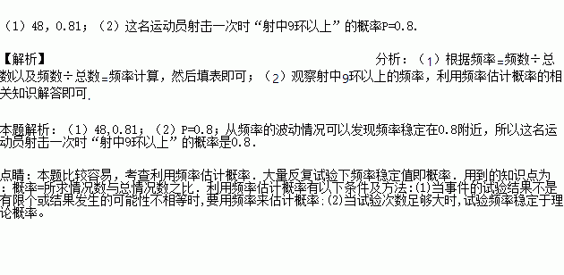 (1)根据上表中的信息将两个空格的数据补全(射中9环以上的次数为整数,频率精确到0.01);