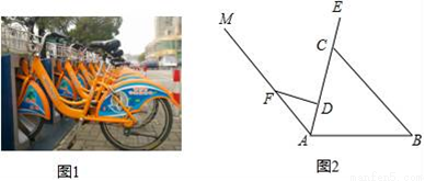 为给人们的生活带来方便,2017年兴化市准备在部分城区实施公共自行车免费服务.图1是公共自行车的实物图,图2是公共自行车的车架示意图,点A、D、C、E在同一条直线上,CD=35cm,DF=24cm,AF=30cm,FD⊥AE于点D,座杆CE=15cm,且∠EAB=75°.