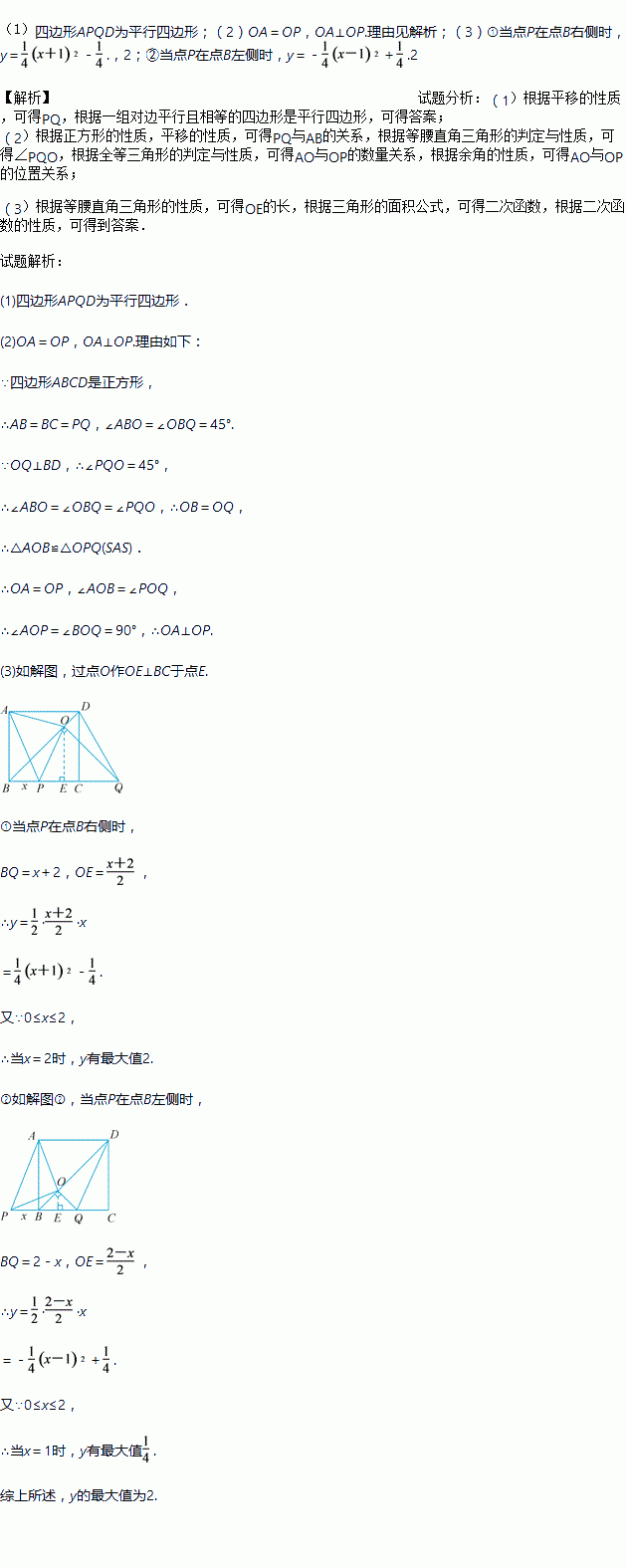 如图,BD是正方形ABCD的对角线,BC=2,边BC在其所在的直线上平移,将通过平移得到的线段记为PQ,连结PA,QD,并过点Q作QO⊥BD,垂足为O,连结OA,OP.