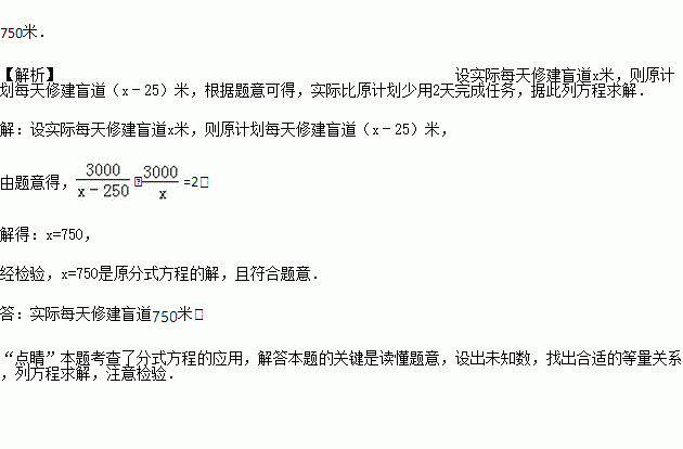 闵行区政府为残疾人办实事,在道路改造工程中为盲人修建一条长3000米的盲道,根据规划设计和要求,某工程队在实际施工中增加了施工人员,每天修建的盲道比原计划多250米,结果提前2天完成工程,问实际每天修建盲道多少米.
