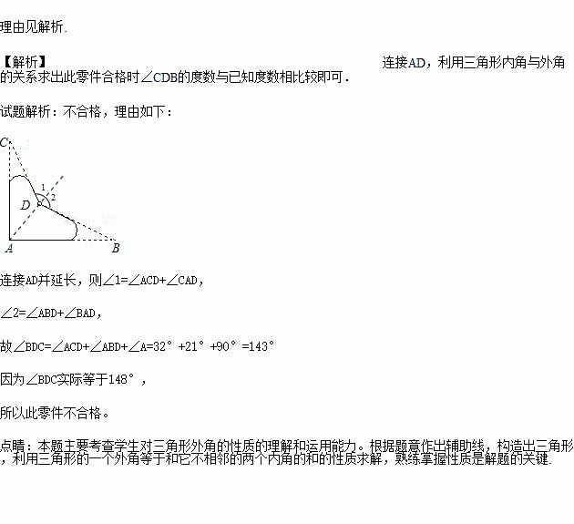 一个零件的形状如图,按规定∠A= 90°,∠B和∠C,应分别是32°,和21°,检验工人量得∠BDC = 148°,就断定这两个零件不合格,运用三角形的有关知识说明零件不合格的理由。