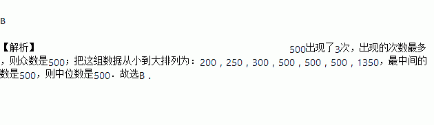 某校7个班同学积极捐出自己的零花钱献爱心,各班捐款的数额分别是(单位:元):500,200,500,300,500,250,1350.这组数据的众数和中位数分别是( )