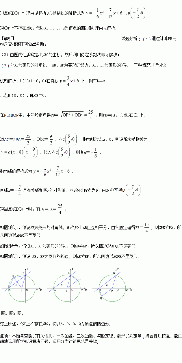 (3)⊙P上是否存在一点Q,使以A、P、B、Q为顶点的四边形是菱形?若存在,求出点Q的坐标;若不存在,请说明理由.