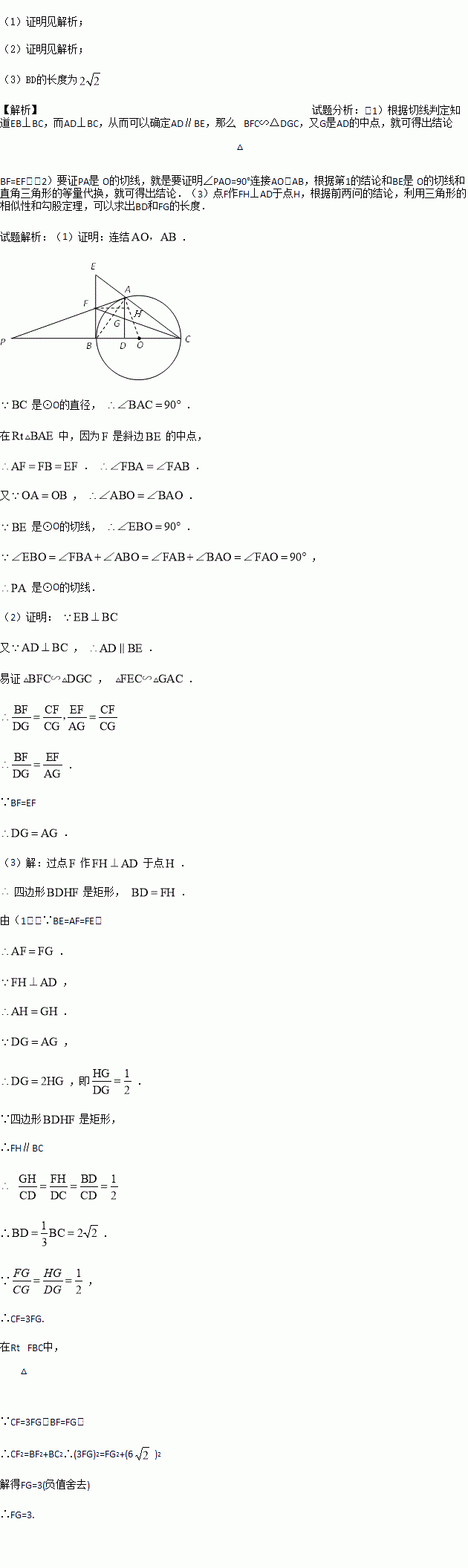 如图1,BC是⊙O的直径,A是⊙O上一点,过点B作⊙O的切线,与CA的延长线相交于点E,F是BE的中点,延长AF与CB的延长线相交于点P.