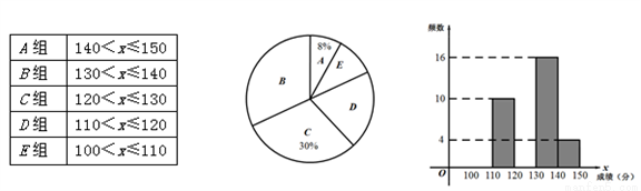 名学生的数学一模成绩进行整理分组,形成如下表格(x代表成绩,规定x>140为优秀),并绘制出扇形统计图和频数分布直方图(横坐标表示成绩,单位:分).