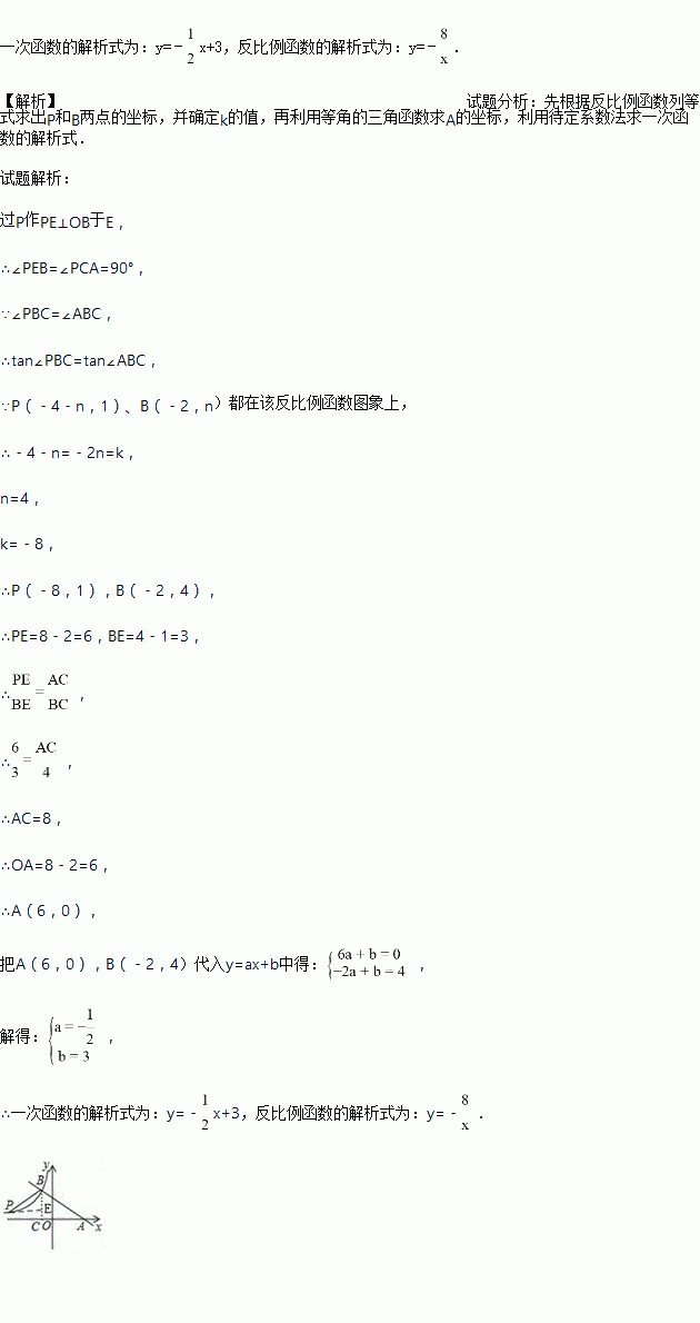 (x<0)的图象交于点B(﹣2,n),过点B作BC⊥x轴于点C,点P(﹣4﹣n,1)是该反比例函数图象上的一点,且∠PBC=∠ABC,分别求反比例函数和一次函数的解析式.
