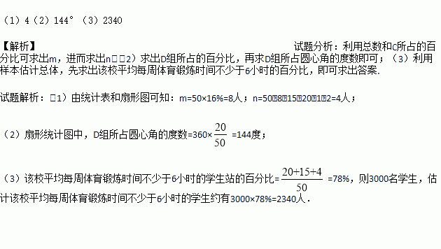 2016年里约奥运会后,同学们参与体育锻炼的热情高涨,为了解他们平均每周的锻炼时间,小明同学在校内随机调查了50名同学,统计并制作了如下频数分布表和扇形统计图。根据上述信息解答下列问题:
