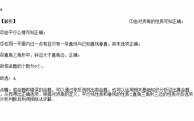 有下列四个命题:①对顶角相等;②过直线外一点有且只有一条直线与已知直线平行;③平面内,过一点有且只有一条直线与已知直线垂直;④直角三角形中,斜边大于直角边. 其中是假命题的个数有( )