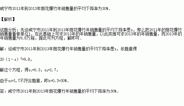 随着市民环保意识的增强,烟花爆竹销售量逐年下降.咸宁市2011年销售烟花爆竹20万箱,到2013年烟花爆竹销售量为9.8万箱.求咸宁市2011年到2013年烟花爆竹年销售量的平均下降率.